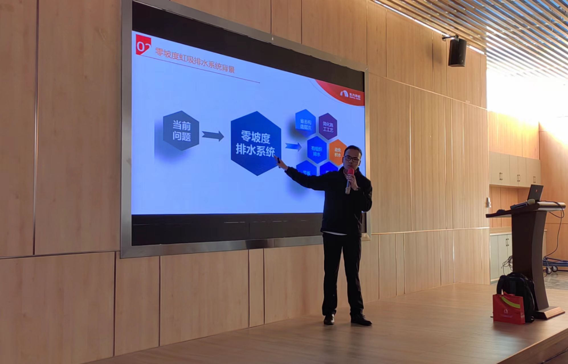 从“桃花源”到“碳中和”,翁老师介绍了东方雨虹的“固碳减排”新思路。首先讲解了零坡度虹吸排水系统的研究背景、政策以及当前的排水现状,并对其原理进行了详细地介绍。随后,讲述了零坡度有组织排水的施工工艺流程和防排一体、有组织高效排水、绿色环保等优势,同时也对新技术在防水领域的应用实践做了更为深入的讲解。