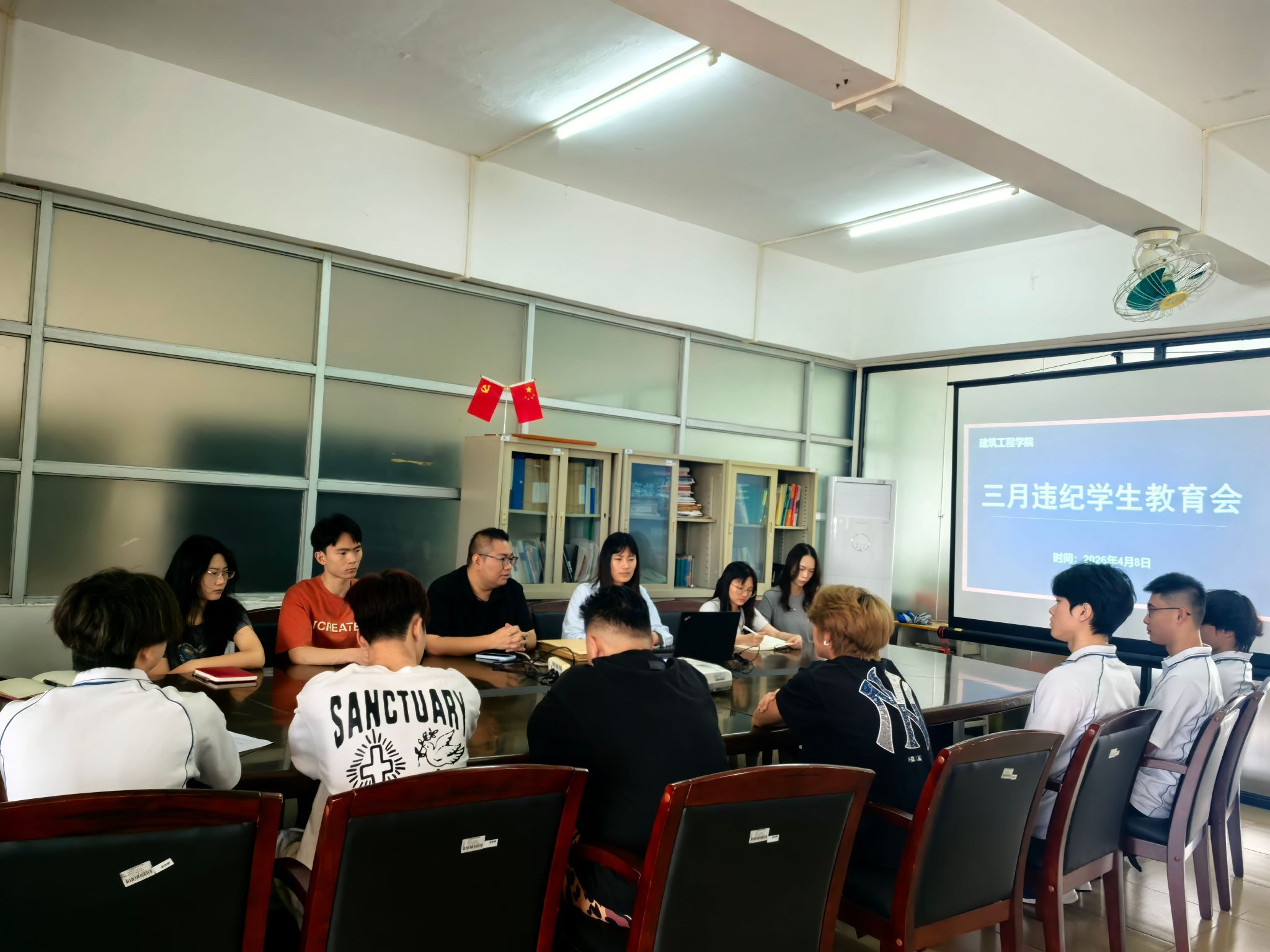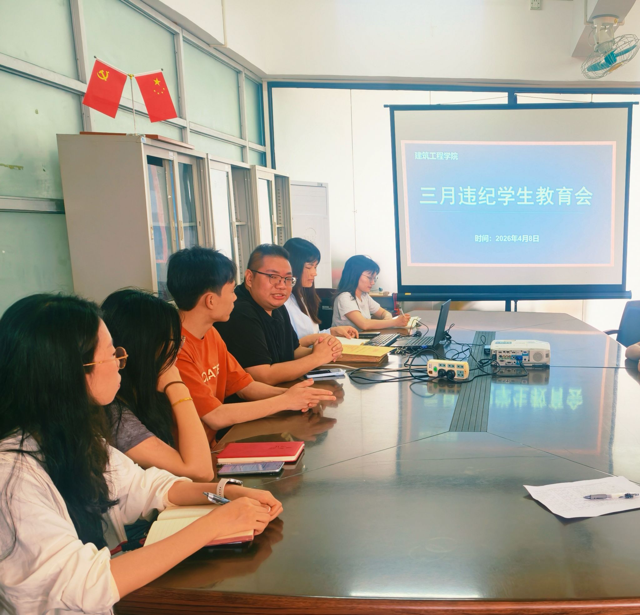 为落实立德树人根本任务,进一步严肃校规校纪,强化优良学风院风建设,引导违纪学生正视错误、端正态度,2026年4月8日上午10时,建筑工程学院在建工机电楼602会议室组织召开3月违纪学生教育大会。学院党委副书记、副院长彭聪,学工办思想政治教育专员莫雪艳,学风建设专员黄燕君、高子姗,社区专员龙福亮、张玉林出席此次教育会。